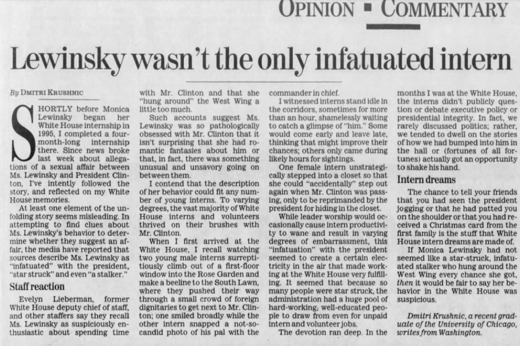 He interned under Bill goddamn Clinton. He worked there mere months before Monica Lewinsky. He wrote this oped in the Chicago Tribune after the Lewinsky scandal came to light.