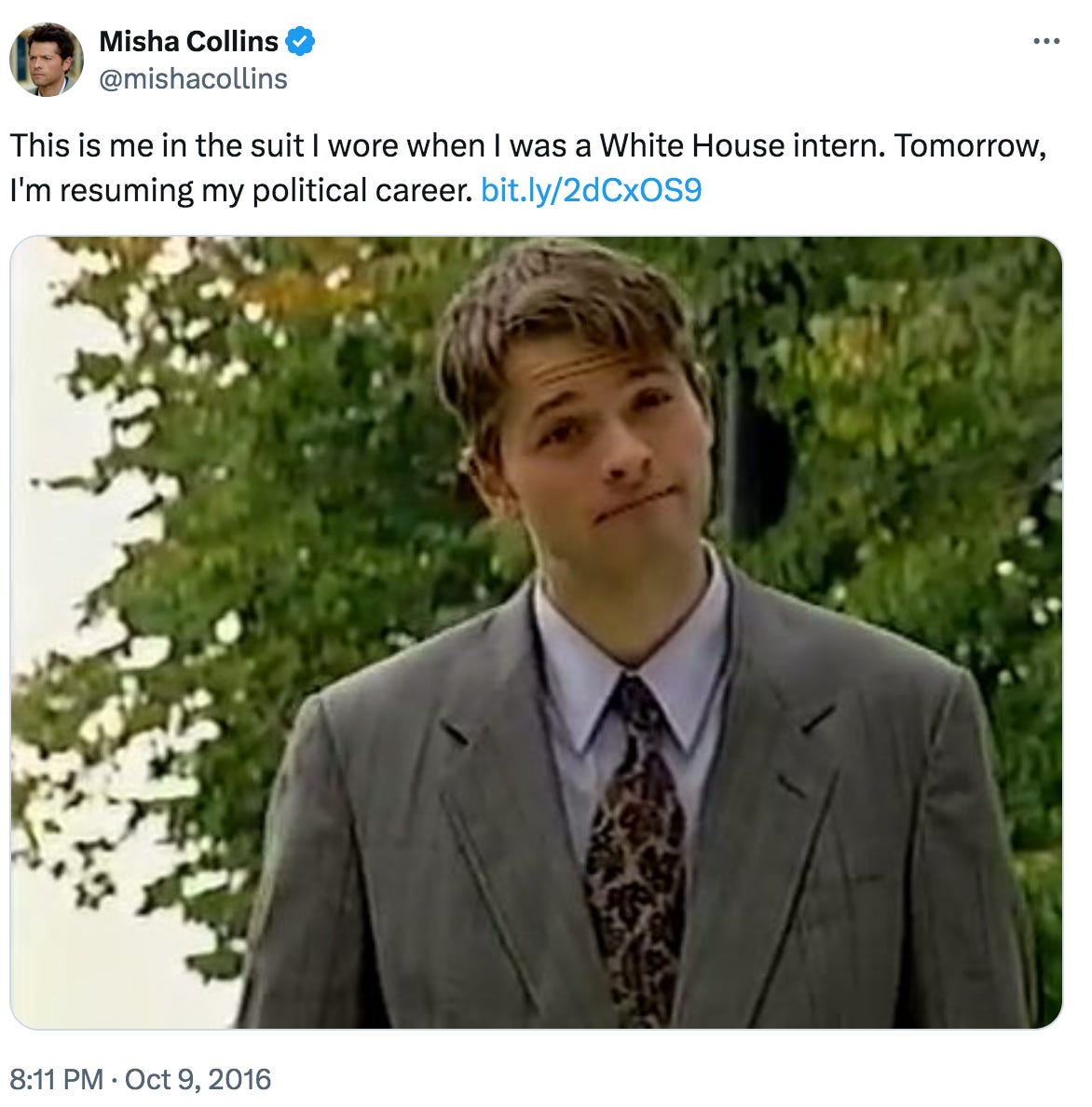 As a trained historian, I did go to the source for this one and found myself deep in the Clinton Presidential Library Digital Archives cause they have records of intern applications. I could not find Misha’s which is a crime. People will tell you it’s because her intern too close to Lewinsky. I (smart) will tell it’s because he got too famous on Supernatural. What are the odds that the Clinton White House would produce two world famous interns???